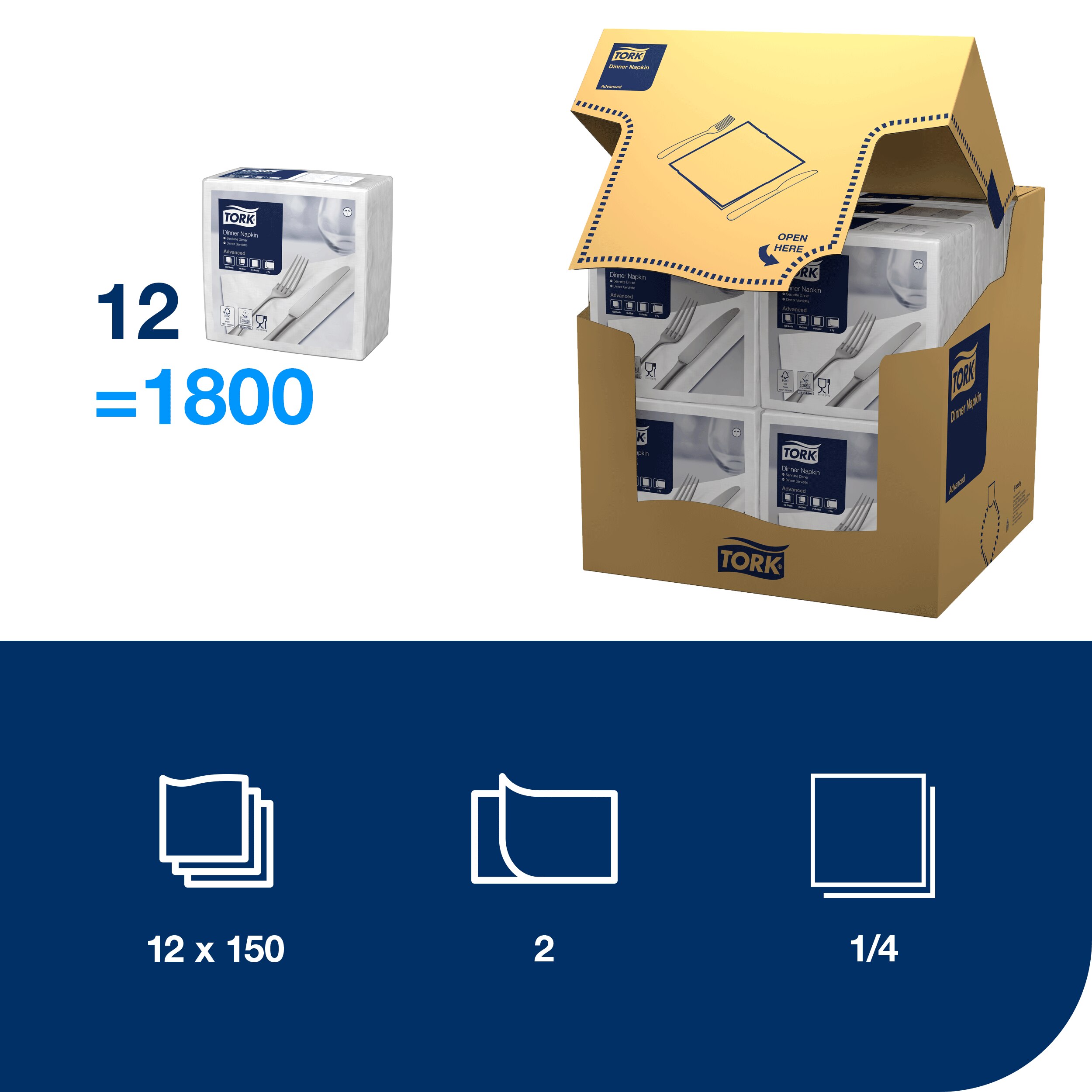 Білі серветки для вечері Tork Advanced підходять для всіх випадків життя та додають класу та практичності звичайному прийому їжі. Справляйте незабутнє враження на гостей, видрукувавши свій логотип на серветках. Це промовисте рішення, яке не залишиться без уваги.