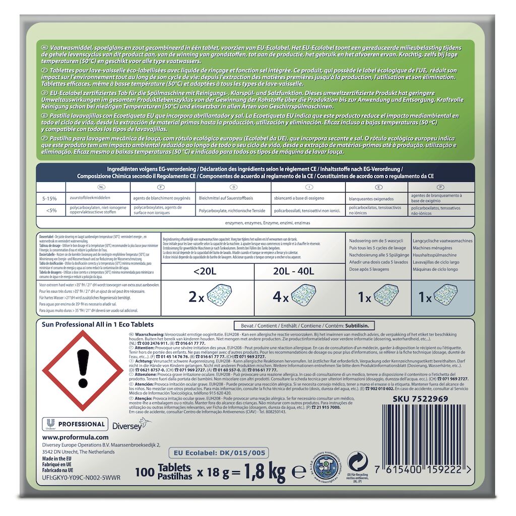 Екологічно чисті таблетки для посудомийної машини «все в одному» Diversey SUN Professional забезпечують потужну ефективність очищення. Не містить ароматизаторів, мають функцію ополіскувача та солі для пом'якшення води. Підходить як для побутових, так і для професійних посудомийних машин з циклом миття 1-5 хвилин. Готові до застосування.