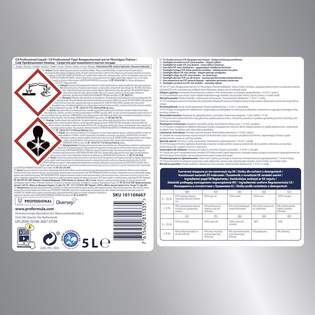 Рідкий миючий засіб для посудомийних машин CIF Professional Liquid Dishwasher Detergent підходить для посуду, столових приладів, скляного посуду, каструль, сковорідок. Використовується в професійних посудомийних машинах. Тривалість циклу 1–5 хвилин.